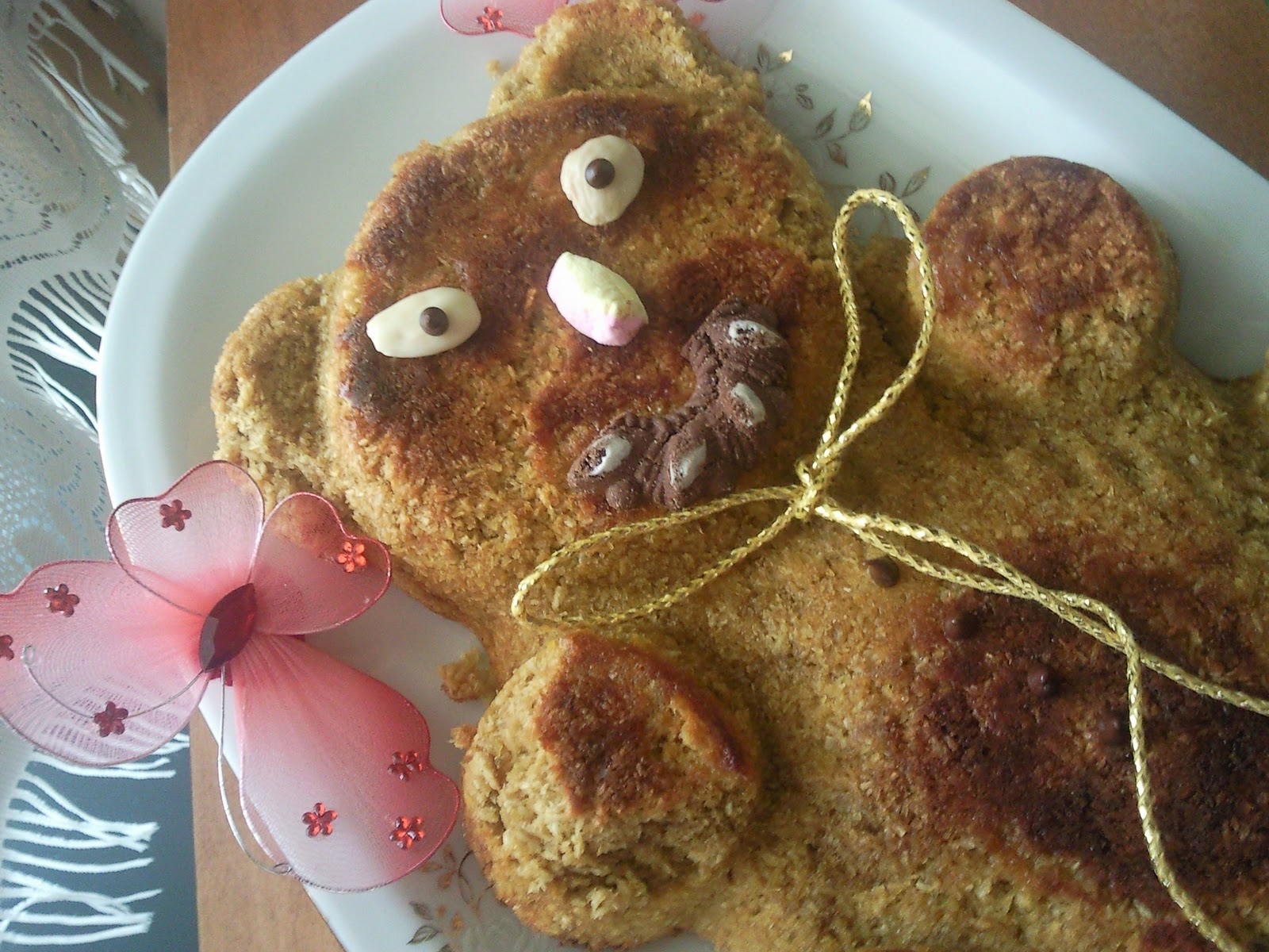 E' da un pochino di tempo che volevo fare questo dolcetto e oggi mi sono messa di punto per realizzarlo , ed eccolo il mio ORSETTO, in realtà sembra un pochino arrabbiato , ma non è così e solo frastornato dai rumori che sente in casa per merito dei miei figli .